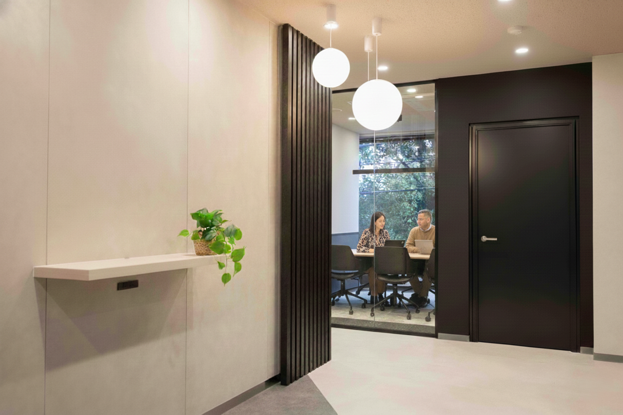 港区のハイグレードビル内に、外資系企業向けのセットアップオフィスを構築しました。半分のみ内装を造り込む“ハーフビルド”により、各社の働き方に合わせて柔軟にカスタマイズでき、ハイブリッドワークにも対応します。デザインは港区らしい格式と品を軸に、ガラスパーティションの会議室が見える洗練されたエントランスを計画。ウェルビーイングにも配慮した、外資企業のスピード感に応えるモダンなオフィスの完成です。